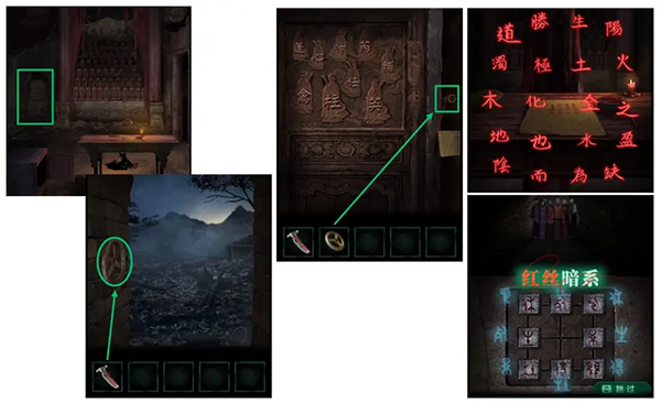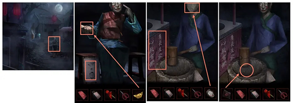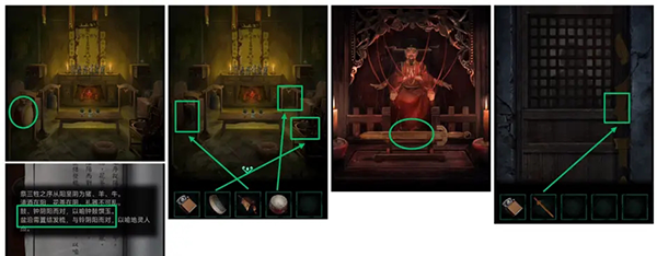 18、切换到二更场景,将【胭脂盒】放到木偶戏台上,拿到【梆子】,获得需要红线的提示。将【梆子】放到黑无常手里,用【锣棒】依次敲击锣、梆子、锣,切换到三更场景(无常贴脸高能)。点击进庙,点击元宝上的机关,解开机关拿到【一串铜钱】。