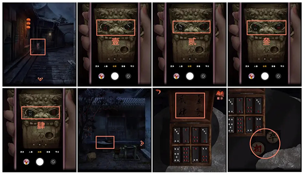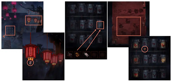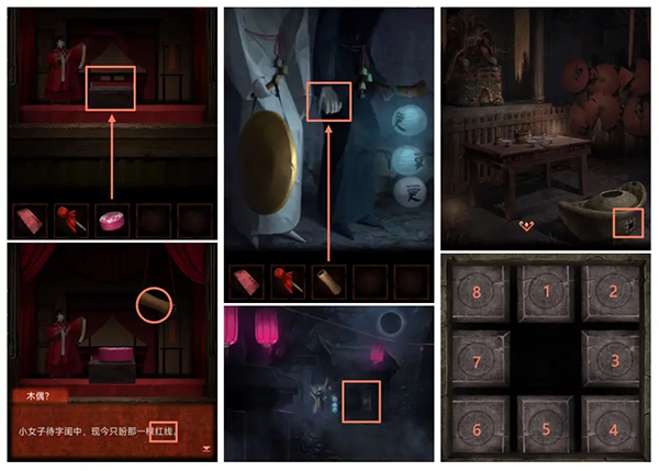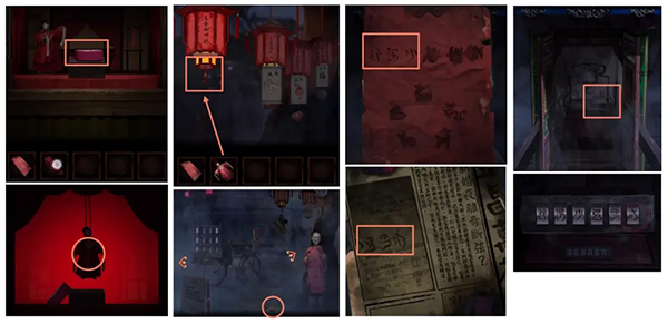 21、切换到二更场景,将【红绳】放到木偶戏台上,点击拿到【新娘木偶】,将【新娘木偶】挂到对应谜语的灯笼下,地上拿到【旧时代报纸】。根据【请柬】和【旧时代报纸】的图案提示,解开花轿里的密码盒(镜中纸人高能)。