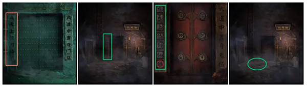 22、用【打火机】点亮左右的灯笼,点击左右的石狮,根据石狮上的文字提示,按顺序点击门环,打开大门。
