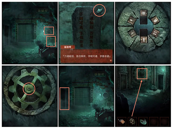 49、崔婉莺:点击石碑拿到【鱼形物件】,根据石碑上的提示,墙上的六道机关要将六个字块调整到都能亮着的位置,解开机关拿到【轮状零件】,往左走,用【轮状零件】启动装置。