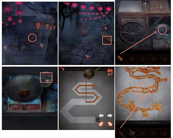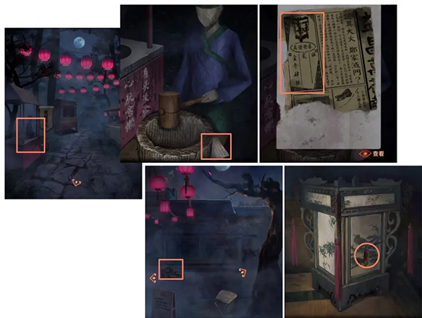 12、点击路牌,拿到【福字玉饰】,根据灯笼上的谜语,将对应的物件挂在灯笼上(纸人惊现小高能),点击拿到纸人手里的【锣棒】。