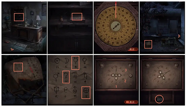 38、把【象棋卒】嵌在石敢当的凹槽中,拿到【黑白棋子】,将【黑白棋子】放在柜子上的黑白鱼盒子上,打开拿到【风水罗盘】。根据张辰瑞说的使用方式,在门锁前拿出【风水罗盘】,将指针和红点重合,红线竖下来对应的即为门锁密码。