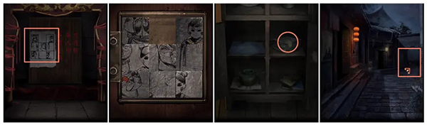 48、根据拼图线索,解开右边拼图机关,拿到【咒符】,从张辰瑞手里拿到另一张【咒符】,离开屋子走出院门。