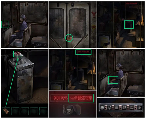 2、点击高跟鞋会被女纸人用手阻拦,根据提示牌上的顺序提示,按顺序点击女纸人的手指,拿到【高跟鞋】和【蜡烛】。用【高跟鞋】敲碎车窗,逃出公交车后点击应急控制开关,打开车门。