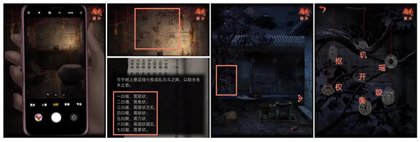 41、对着墙拿出【手机】(砸机高能),墙上出现字,根据墙上的字和《太一宝鉴》的提示,调整树上的花钱,拿到【发条】。