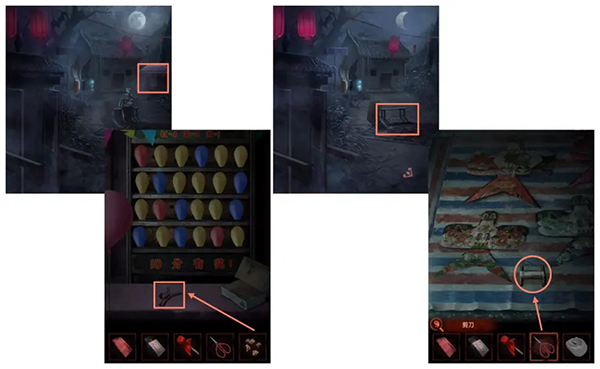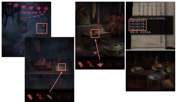 14、到一更的右边场景,点击第一个摊位,点击右下角的研究资料,点击纸张翻到背面。根据研究资料背面的报纸线索,按顺序点击灯笼的三条红绳,拿到【剪刀】和【纸元宝】。顺序:左中左左右左