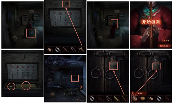 42、点击椅子,将【发条】装上,根据椅子上的笛谱,点击纸人开始演奏,演奏完拿到【黄裱纸】和【小钥匙】。将【小钥匙】插在门锁上,用【象棋相】拧动钥匙,打开门锁。