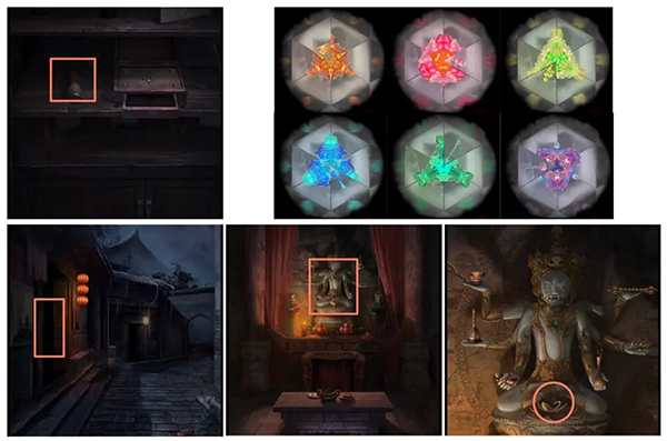 45、点击柜子上的万花筒,(万花筒高能)切换可以看到六个物件。进入打开门的房间,点击藏尊,根据万花筒中各个物件的方位,调整好物件的位置,拿到【环状饰品】和【小方块】。
