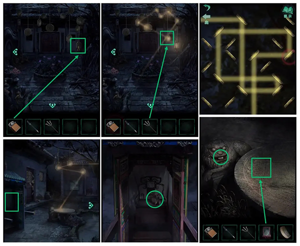 23、到左边场景过剧情,点击窗户,用【红圆珠笔】捅破窗户后,从崔婉莺手里拿到【线索纸】。点击院子的假山,根据【线索纸】的提示,按顺序点击假山上的物件,拿到【三叉戟】。
