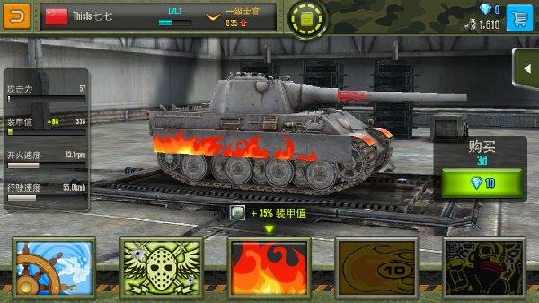 点击开始,进入游戏备战室,这里有坦克库(选择你要上场的所拥有的坦克),兵工厂(可以升级装甲、炮管、引擎等),涂装(坦克花纹,可以增加攻击力和开火速度)以及贴花(标志,可以增加攻击力和速度),其中涂装和花纹用钻石买,而且有时间使用限制,大概两天就消失。