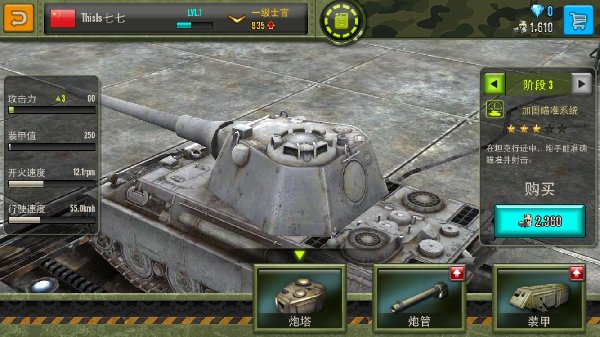 坦克改装系统:升级炮塔、炮管、装甲等部件,搭配涂装(提升攻击力/速度)与贴花(增强装甲/移动)。