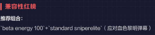 1、推荐组合:`beta energy 100`+`standard sniperelite` / `yannokakora c`+`beta pebox 100`