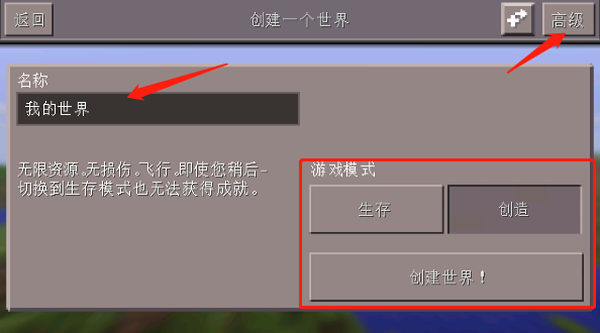 2、你可以在编辑框里输入世界的名称,还有生存和创造两个模式供你选择,我们也可以点击右上角高级选项,看看里面有什么。