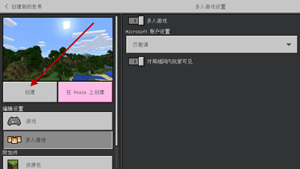 2、接着点击游戏新建,创建一个全新的世界,然后修改一些你习惯的设置,但关于多人游戏的设置,一定要打开,也要打开“对局域网的玩家内玩家可见”这个设置,minecraft账户设置建议调成仅邀请,避免其他玩家进入。