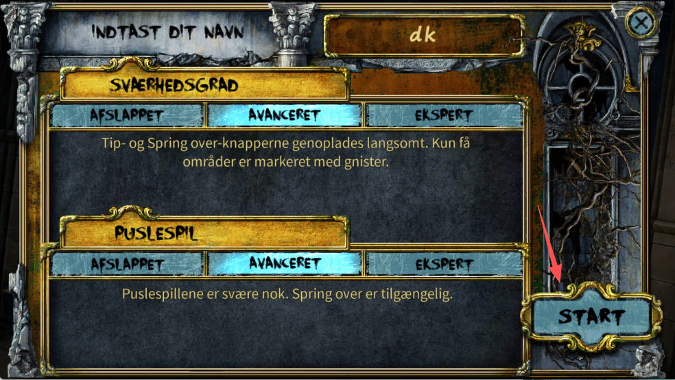 打开游戏后点击 START 进入主菜单,可先调整难度、输入角色名称,然后点右下角按钮正式开始。