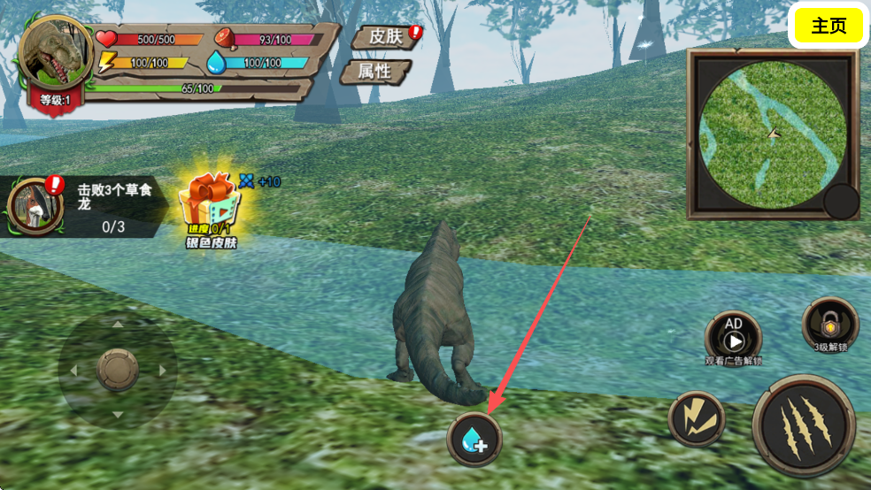4、走到河边时,点击“饮水”按钮会让恐龙饮水
