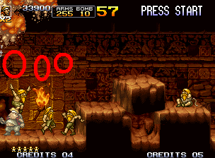 之后在过去一点点会来到一个像----____----的地方,这个地方只要迅速的跳到左上角的地方然后对着右边一直开枪就可以安然无事的渡过。在这边的最后会有一只拿斧头的土人会从左上出来,在这边你只要原地不动一直使用近身攻击(这边一开始就跑去右上角打就可以直接成功,因为右边那只也可以,而且成功率比较高,就可以一直赚分(这个赚分方式...应该是设计者的疏失..我第一天玩就发现了)
