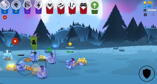 前期打法:一开始建议先出个矛兵,然后出8个矿工。这是因为一个矿区最多只能有两个矿工同时挖矿,超过两个的话,多余的矿工会跑到对方的矿区去挖。当敌人来袭时,控制矛兵顶盾吸引伤害,让城堡弓兵射击,这样可以保护雕像不受攻击。