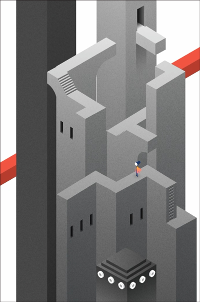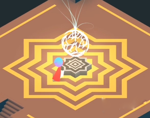 场景三先将建筑转成下图这个样子,接着进入传送门,小人会从中间一层的门出来,再次旋转建筑,组成楼梯,使小人可以向上攀登,最后三次旋转可以带领小人进入最终的门啦!场景四中的凸弧形墙与凹弧形墙都是可移动的,先利用凸墙移动到前侧灰色按钮处,再到另一个按钮处,图腾出现,本章完结。