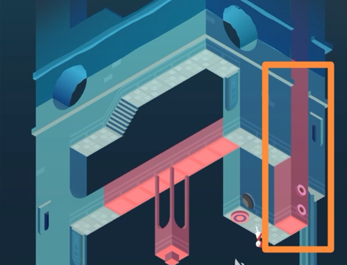 本章节的设计较为独特,玩家先控制粉色建筑下来,然后转动它,使得萝尔母女可以站到它上面。接到人后,就再次移动它,将小人们送到门处。第二个场景有许多传送门,玩家可以转动左侧传送门于下图这个位置,让女儿可以通过它来到萝尔身旁,并按下按钮,再次转动此建筑,让女儿去按另一个按钮,移动下面的建筑,母女二人即可先后进门。