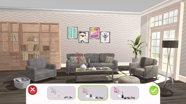 游戏目标:利用拖拽的方式,装饰情景中的各项家具事物,金币可通过消除获得,可自由从三种默认的家具中挑选你所中意的装饰品来填补这个原本十分简陋的房间,游戏没有具体的标准,全部完成家具的装扮,还会以不同的镜头为你展现你设计的家居风采。