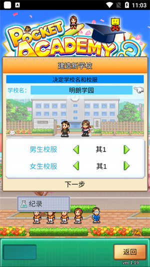 2、开始创建新学校,玩家需要创建学校名,设定好男生和女生的校服,然后点击下方的【下一步】;