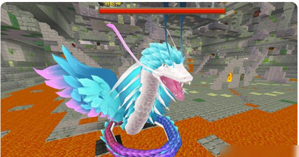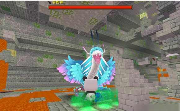 5、进入建筑物后可以看到强BOSS羽蛇神在底部,当玩家靠近的时候就会被攻击,它的攻击方式是向玩家吐出绿色的气体,只要玩家碰到后就会迅速的掉血,所以要时刻保持注意力,需要灵活的走位操控才能避免被羽蛇神的武器攻击到。