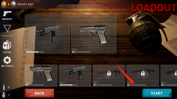 1、初次进入游戏,我们可进入备战区装备升级枪械,或购买手榴弹和燃烧瓶等投掷物;