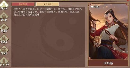 点击界面左上角的头像,这里集合了人物属性、背包物品、调整武学、解锁兵种、书籍装配、个人卡等界面。想要了解更详细的信息,可以点击文字旁边的放大镜图标。人物本身主要分为主要属性以及其他能力,游戏内都有详细的文本说明。