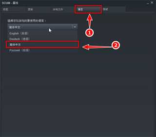3、打开SCUM的属性后,点击语言选项卡,把语言选到简体中文。