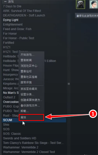 2、在游戏SCUM名字上点击右键,选择属性。