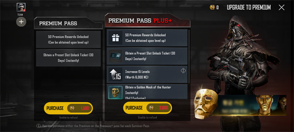 在将生存通行证升级为豪华通行证时,你可以获得一套特殊套装。升级到豪华通行证Plus+则可以获得更多奖励!