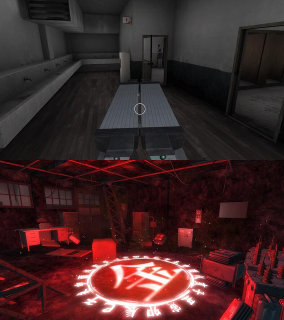 13、从地图最左侧的楼梯一路上到4F,打开门剧情过后进入泳池女鬼BOSS战,注意L型铁杆,如果是平行的那就能走,交叉的就不能走,如果遇到不能走了,就360°原地转圈,肯定有条路是平行的(反正我一口气走到对面了),走到泳池对面把水闸关了,泳池里的地上可以拿到「水之牌」,从这边的门重新回到大厅四楼。
