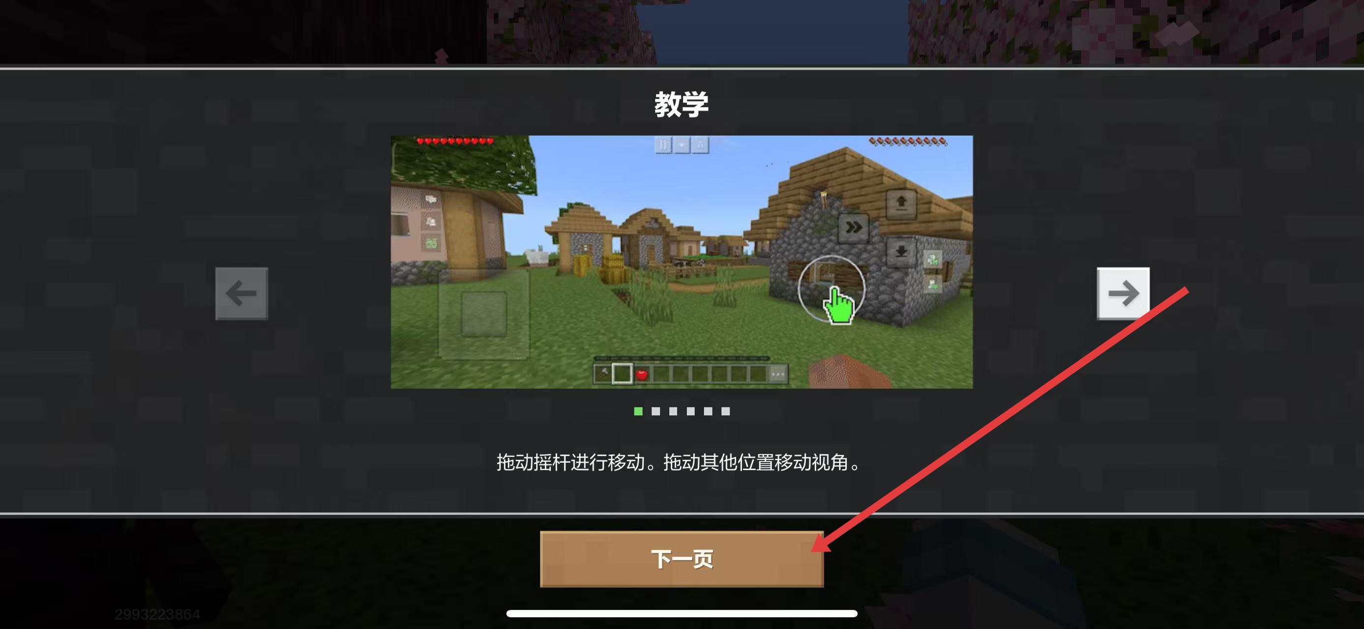 3、进入教学页面,按提示了解“拖动摇杆移动、拖动其他位置移视角”,点击下一页继续学习操作。