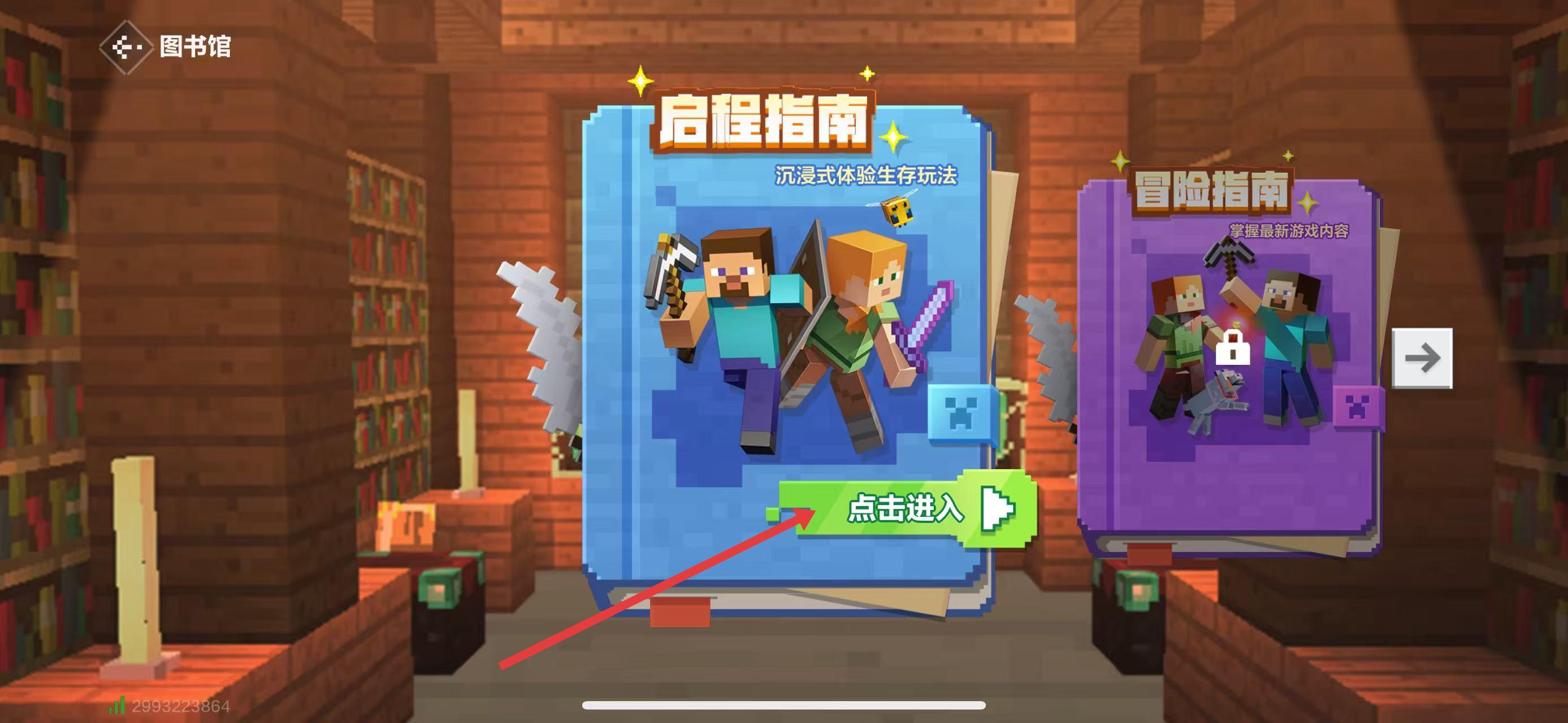 1、进入我的世界图书馆场景,点击启程指南的点击进入,查看生存玩法引导。