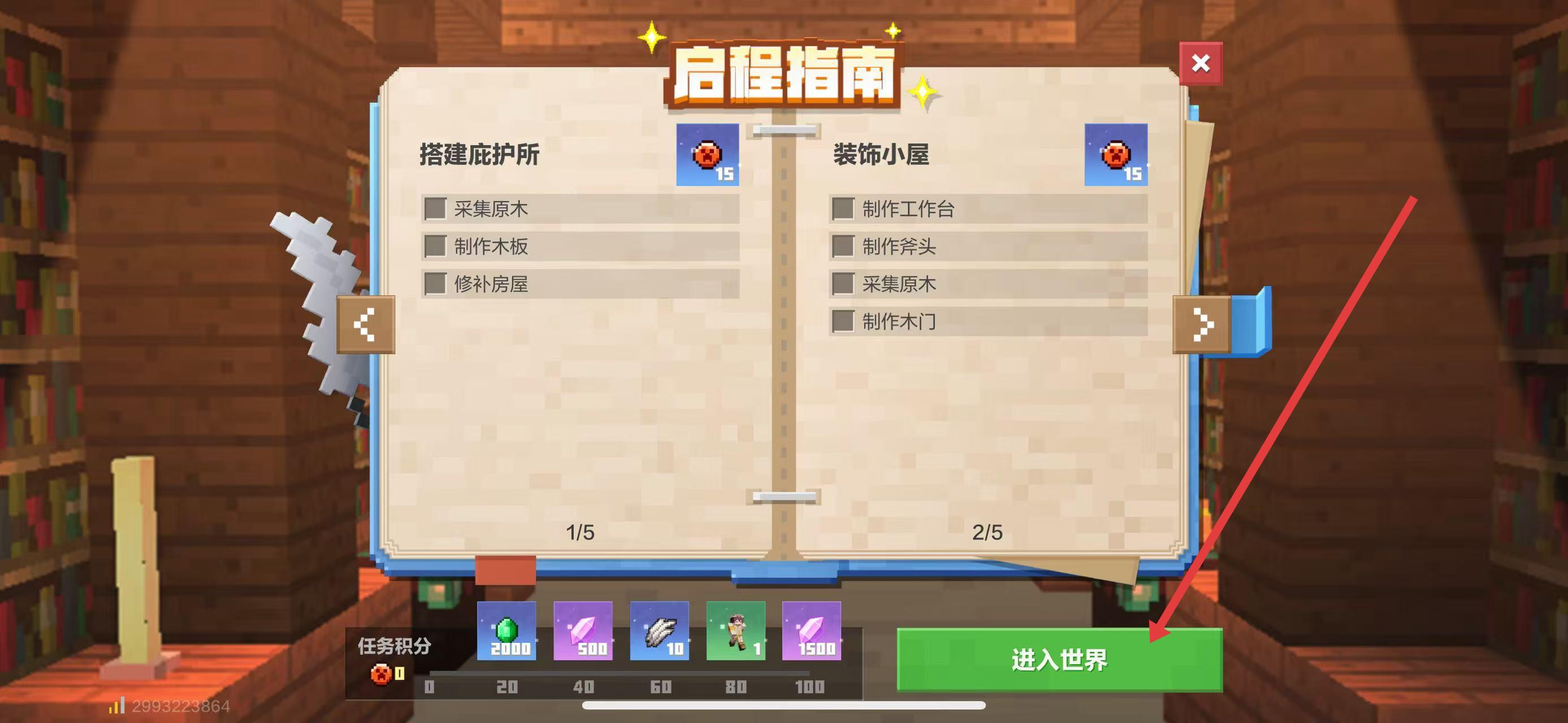 2、在启程指南界面,浏览“搭建庇护所”“装饰小屋”等任务后,点击进入世界开启游戏。