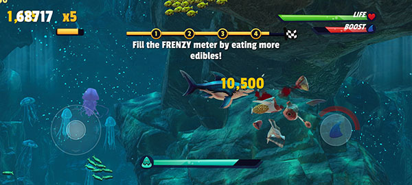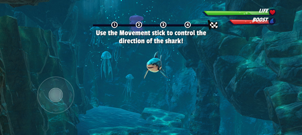 2、然后通过虚拟按键操作鲨鱼,右边鱼鳍可以加速。