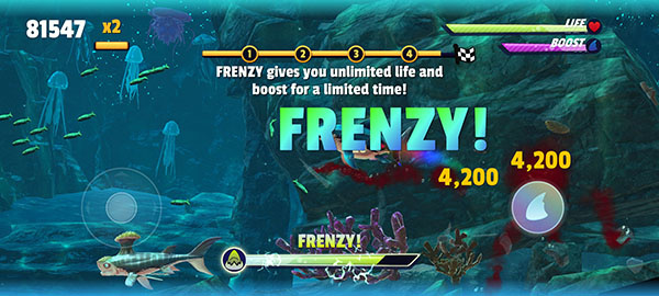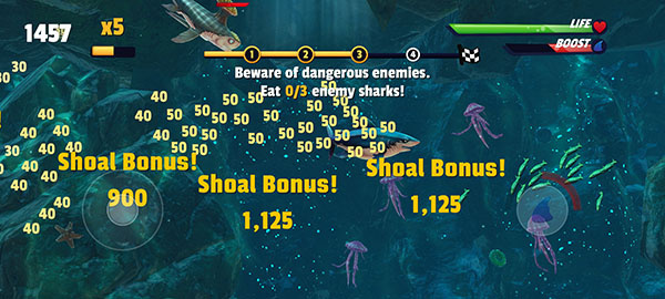 5、过完新手教程后就可开始游玩了,玩家可操纵鲨鱼吞噬小鱼,当下方能量条满后还可获取加速度,获取更多分数;