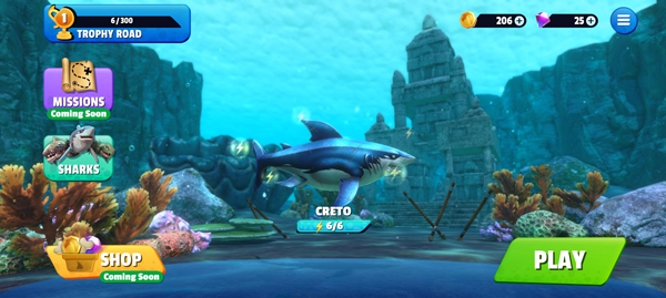 7、另外,游戏结束后得分越高,获取的金币和经验也就越多,金币可用来升级或解锁新鲨鱼。