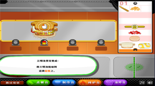 制作台:做三明治时务必要把东西放在中间,还有就是认真看菜单,不要弄错程序。