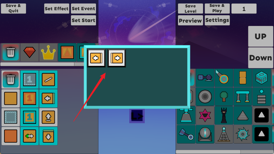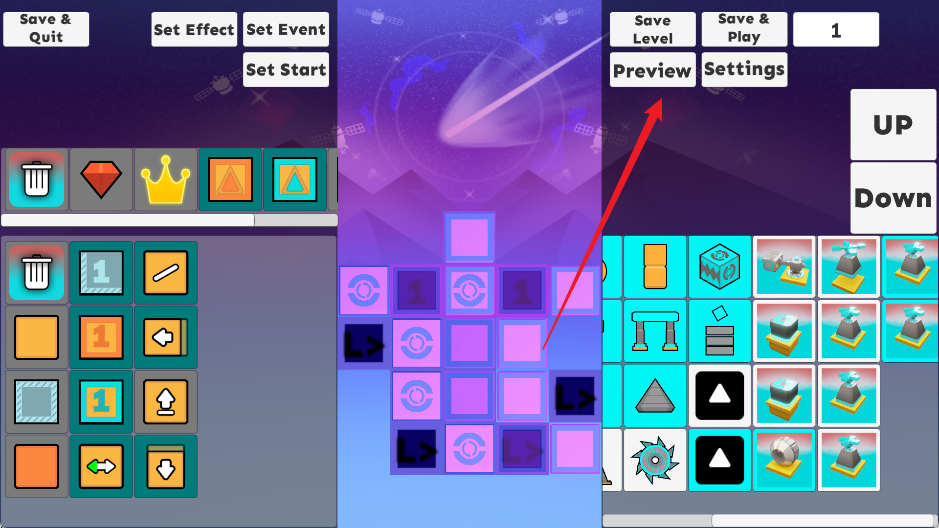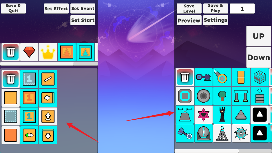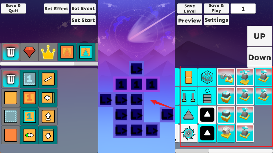 2、界面左侧是各种地板与奖励元素,右侧则是道具与机关,可以根据自己的创意自由搭配;
