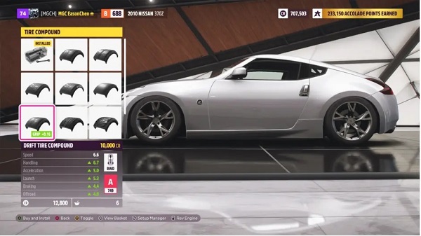 近两年,随着各种漂移赛事的热度逐渐升高,极限竞速也开始注重起漂移这种赛车技巧。 那么什么是漂移?漂移并不意味着失控。车辆打滑导致轮胎空转与地面摩擦产生烟雾也并不能称之为漂移。真正的漂移动作,在从起飘到入弯再到出弯全程都是可以控制的。 而在练习漂移之前我们也需要对车辆进行改装,下面以Nissan?370Z为例: