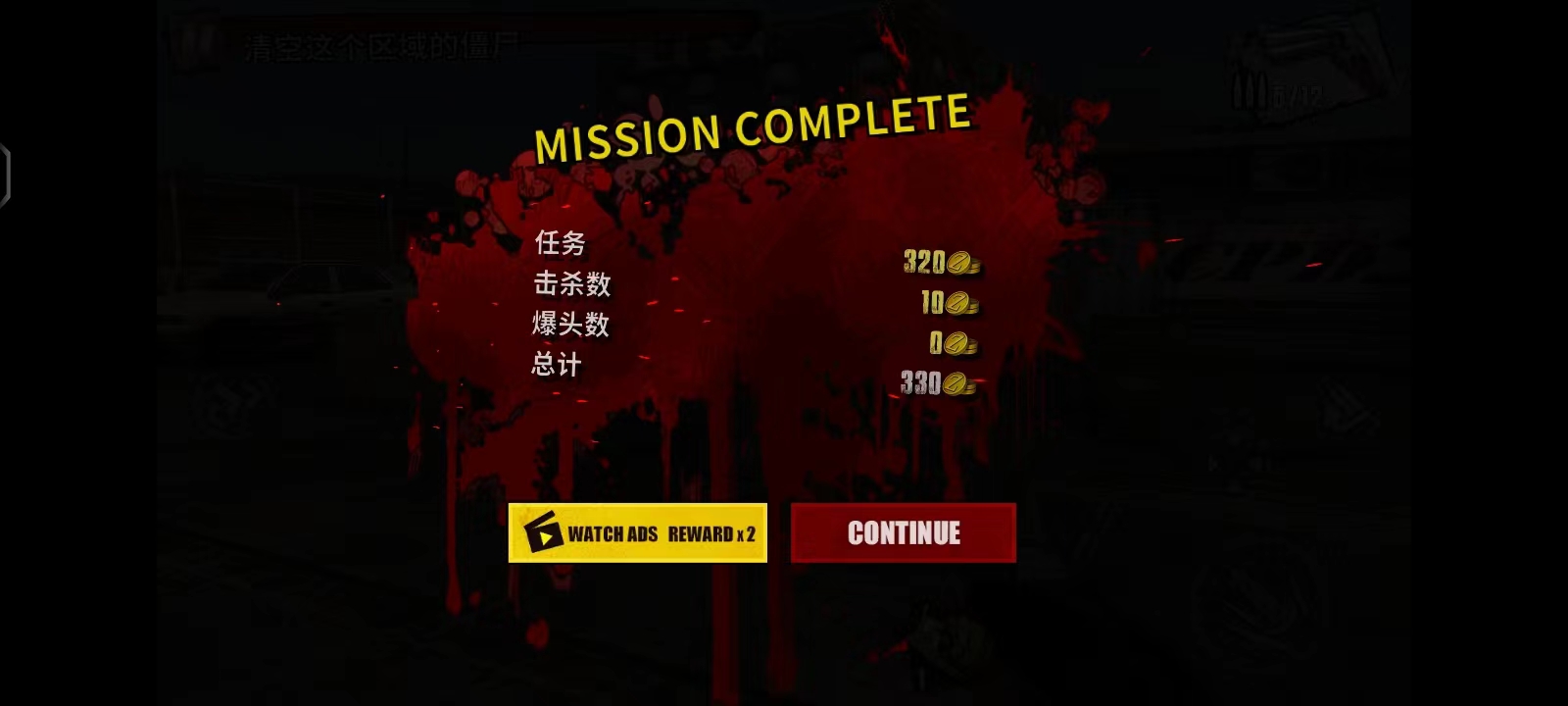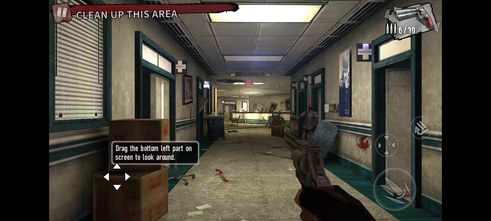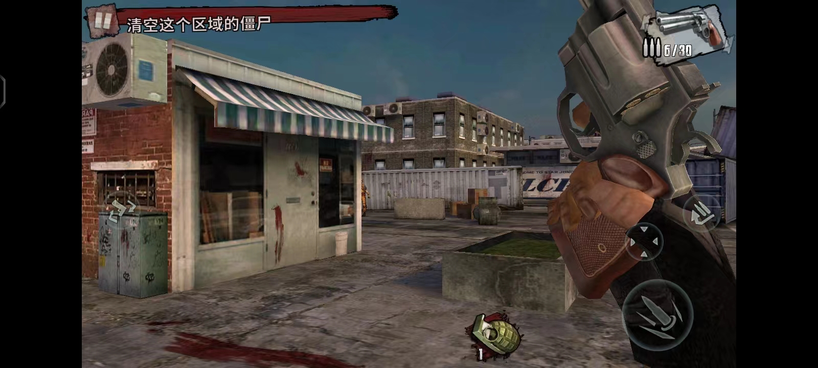 4、进入游戏后,左上角会出现这局游戏的任务,清空这个区域的僵尸,左边控制方向,右边的按钮则是射击、瞄准以及加子弹;当有僵尸出现的时候,用手指在左边滑动进行瞄准,然后射击;游戏过程中,注意一些油桶,击爆它可能会帮助你瞬间杀死附近的僵尸;