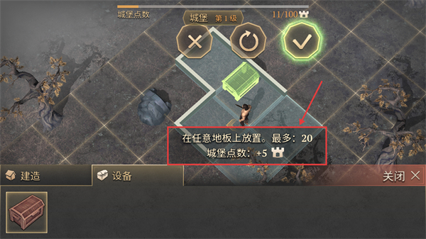 4、将制作好的【农家宝箱】放置在地板上,每个可增加【城堡点数-5】,最多放置20个,提升城堡等级。