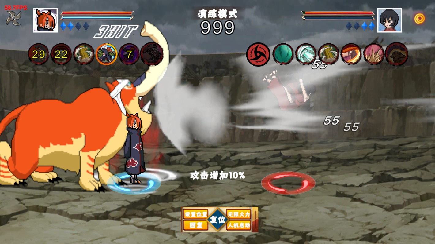 2、目前有无尽试炼(肉鸽爬塔),忍界大战(战场闯关),对战演练(pvp)三种玩法。新手可以先去【演练】体验一下角色,练习各种搓招