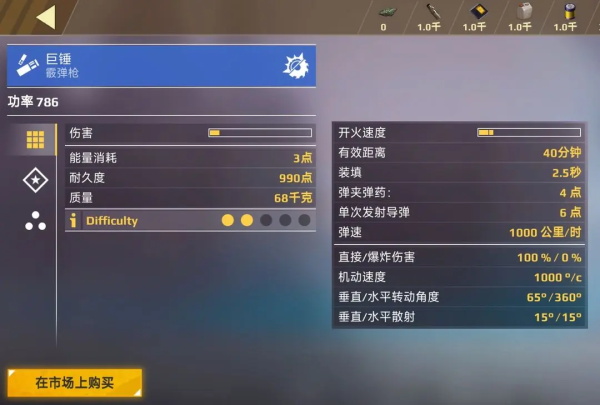 对于萌新工程师而言,如果作战风格属于“战车格斗”,即使用快速的轻型车辆进行近距离战斗的话,那么霰弹枪便是非常不错的选择。如下图的“巨锤”霰弹枪,弹夹中存有4发弹药,每次发射6枚弹丸,并且稀有度也仅为蓝色,在游戏早期属于非常物美价廉的物资。