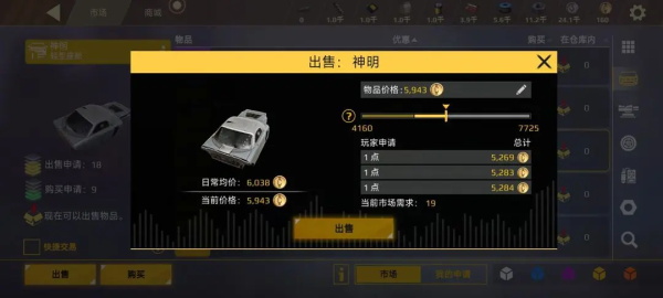 上图的“神明”现在正显示红色的上箭头,这代表能够立刻出售一个物品。此时,我们点击“出售”按钮会显示下图所示的交易申请界面,可以通过滑动条来调整我们所想要的交易价格,而此时在滑动条上处于亮黄色的交易价格代表以该价格进行交易申请将会被机器人立刻处理。