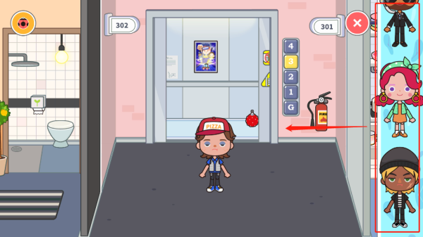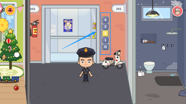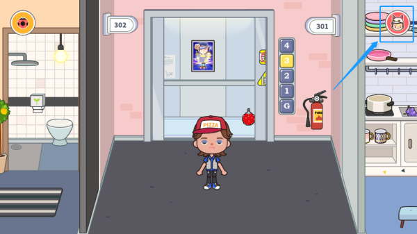 3、点击图示电梯按钮,自由穿梭于公寓各楼层(1F社区大厅/2F亲子层/3F创意层/顶楼观景台)及外部街道场景,拓展探索边界