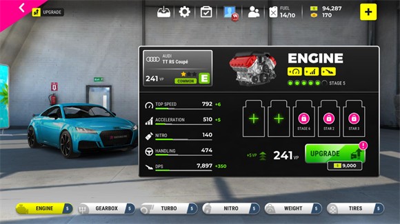 4、可以对车辆的引擎、操控、涡轮、喷气、速度、轮胎进行升级,升级需要消耗金币。