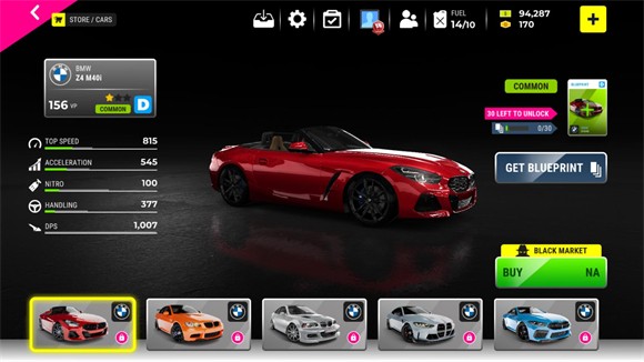 3、你可以点击左侧的ABCDE来选择不同等级的车辆,然后选择想要购买的车辆来解锁。